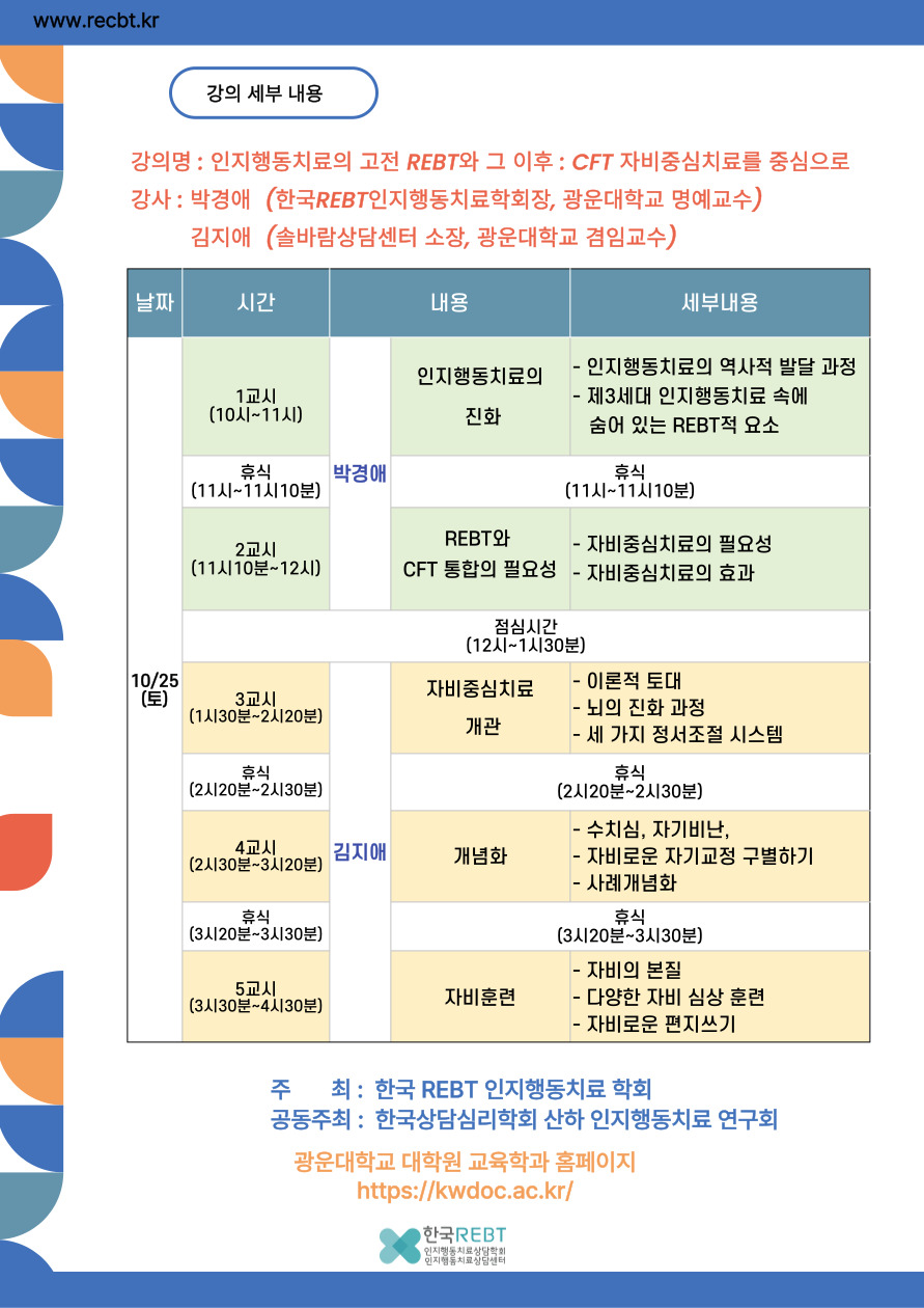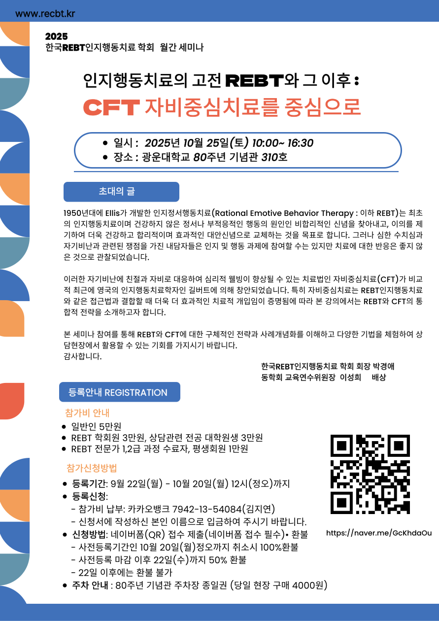 제목 | [2025]REBT 1급 전문가와 함께하는 REBT인지행동치료 월간 세미나(10월) |